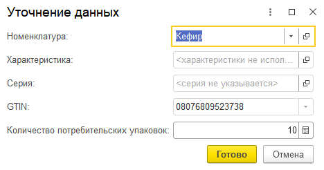 В форме подбора и проверки маркируемой продукции при считывании КИЗ, требующего индивидуализацию будет открыта форма Уточнение данных. В этой форме требуется выбрать номенклатуру и GTIN, которые будет записаны в RFID-метку. GTIN (EAN) может быть считан сканером штрихкода. В этом случае будет запрошено считывание данных метки оборудованием RFID. После выбора GTIN требуется записать его в RFID-метку.