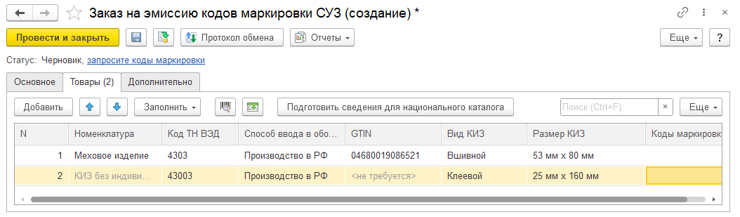 Для заказа на эмиссию КиЗ для натурального меха используется документ Заказ на эмиссию кодов маркировки СУЗ.