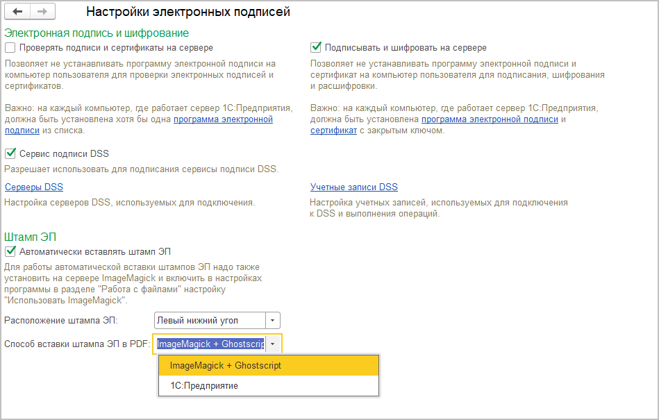Для этого в настройках электронной подписи предусмотрена настройка Способ вставки штампа ЭП в PDF.