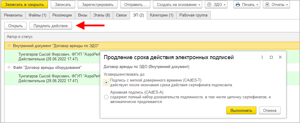 Для подписей базовых форматов доступно продление действия путем добавления метки времени, если на момент проверки сертификат еще не истек:
