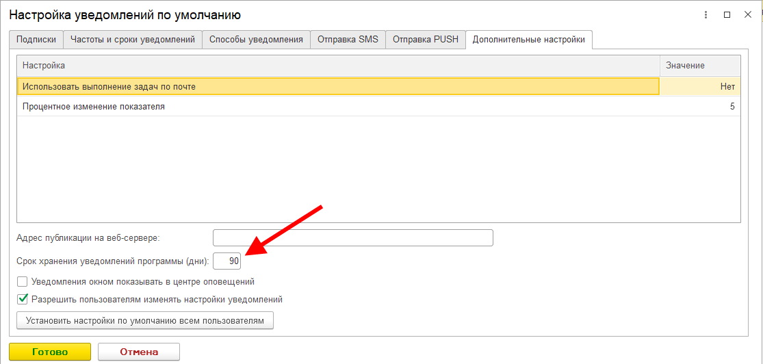 Для этого в настройках уведомлений по умолчанию необходимо указать срок хранения уведомлений в днях.