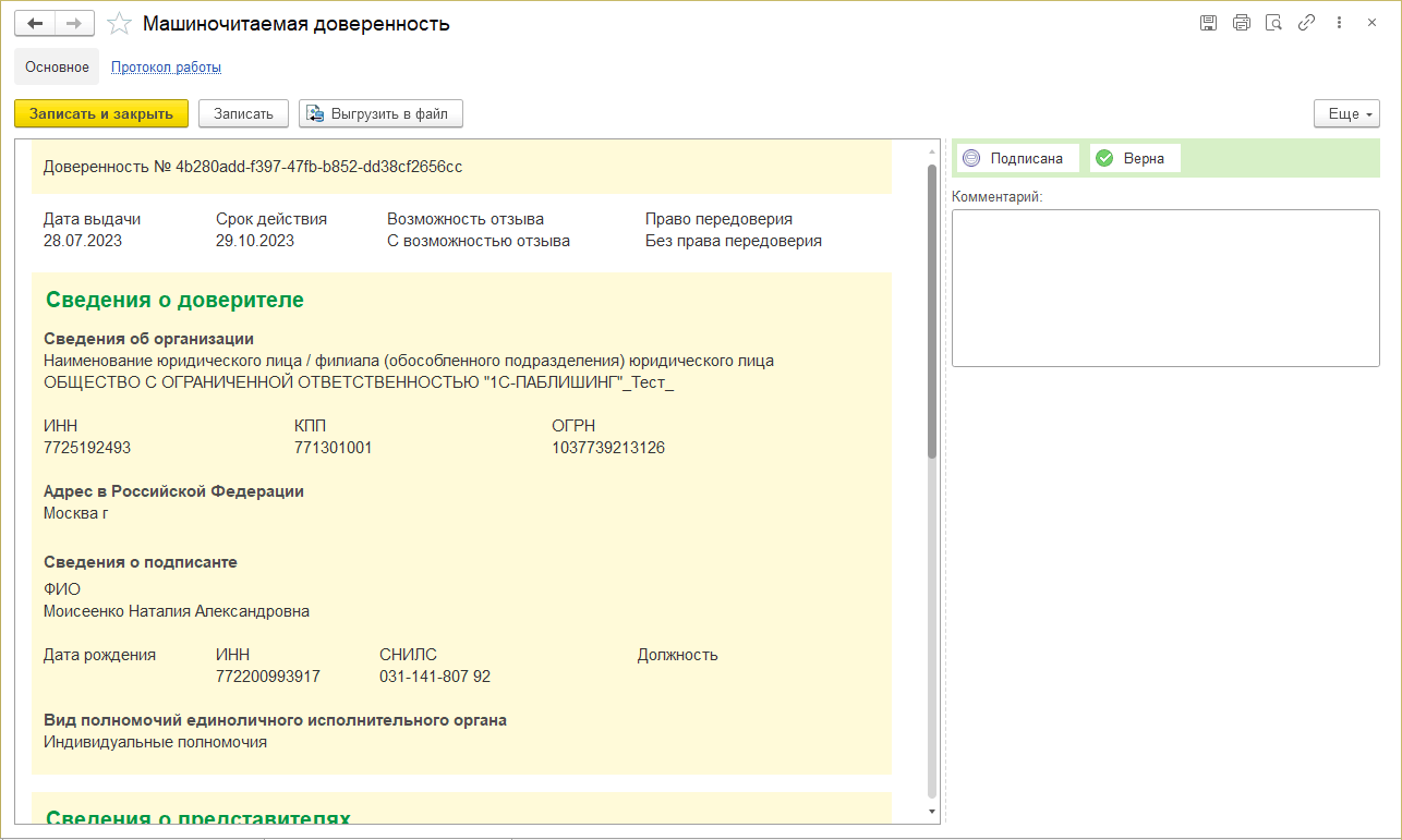 Если электронная подпись выполнена по доверенности, то при формировании штампа этой ЭП будет отображаться доверитель и номер доверенности.