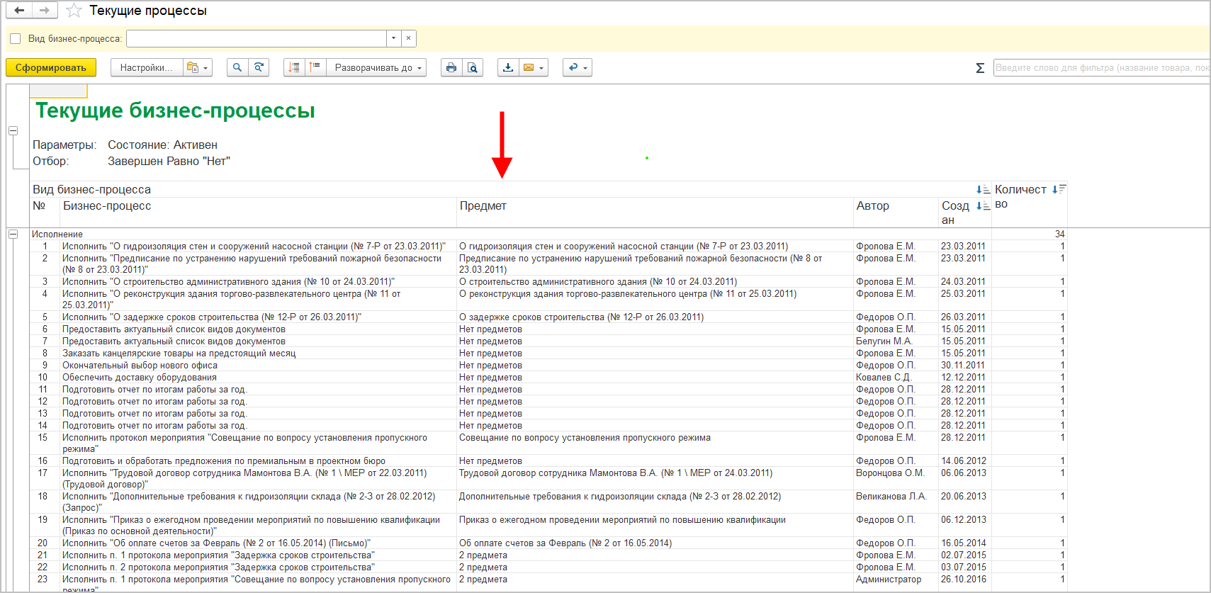 В отчетах по бизнес-процессам теперь выводится предмет, по которому запущен процесс.