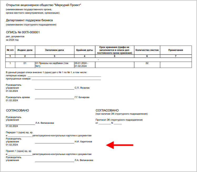 ■ Информация о сотруднике, принявшем документ в архиве. Если документ еще не принят архивом, отображается шаблон ФИО, подпись.