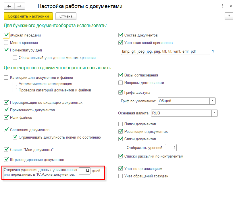 В программе теперь можно отсрочить фактическое удаление данных уничтоженных или переданных в 1С:Архив документов на любое количество дней. Это оставляет возможность передумать и отменить операцию уничтожения.
