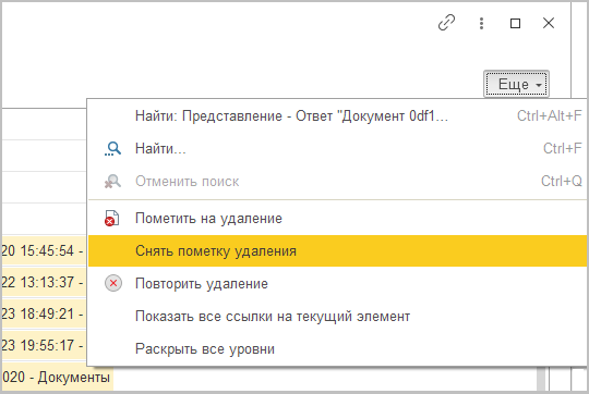 Отменить выделение объектов можно командой Снять пометку удаления в контекстном меню или в меню Еще.