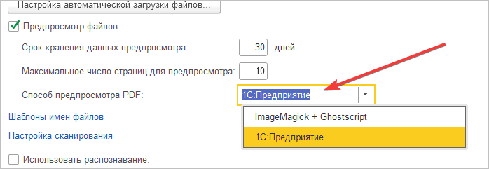 В новой версии программы можно использовать встроенный предпросмотр PDF-файлов без установки Ghostscript. Для этого в настройке Способ предпросмотра PDF достаточно выбрать вариант 1С:Предприятие.