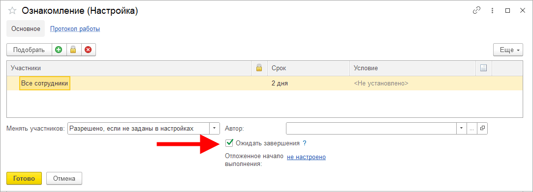 Но теперь в карточке правила обработки можно установить настройку Ожидать завершения, тогда следующее действие не начнется, пока все участники не завершат задачи ознакомления.