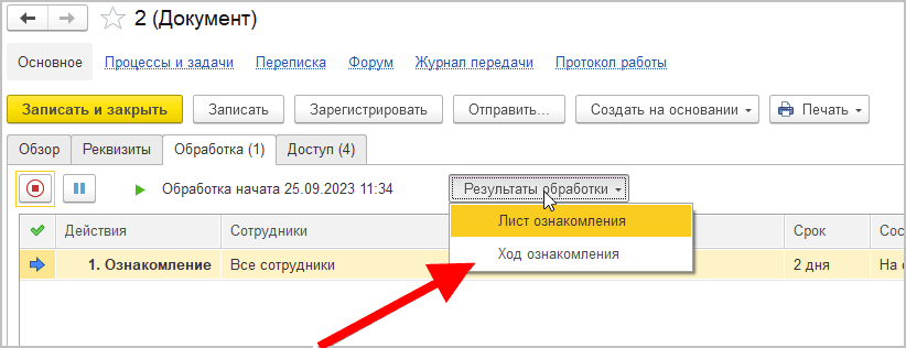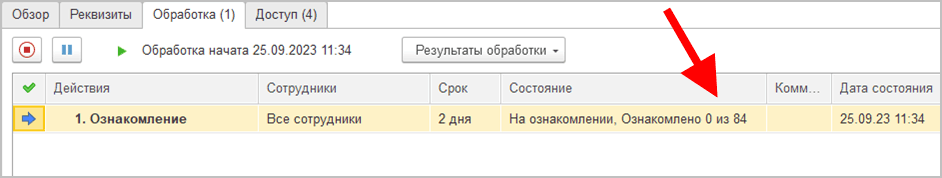 По умолчанию при отправке ознакомления большому количеству сотрудников программа сразу переходит к следующему действию по маршруту обработки, не дожидаясь завершения ознакомления.