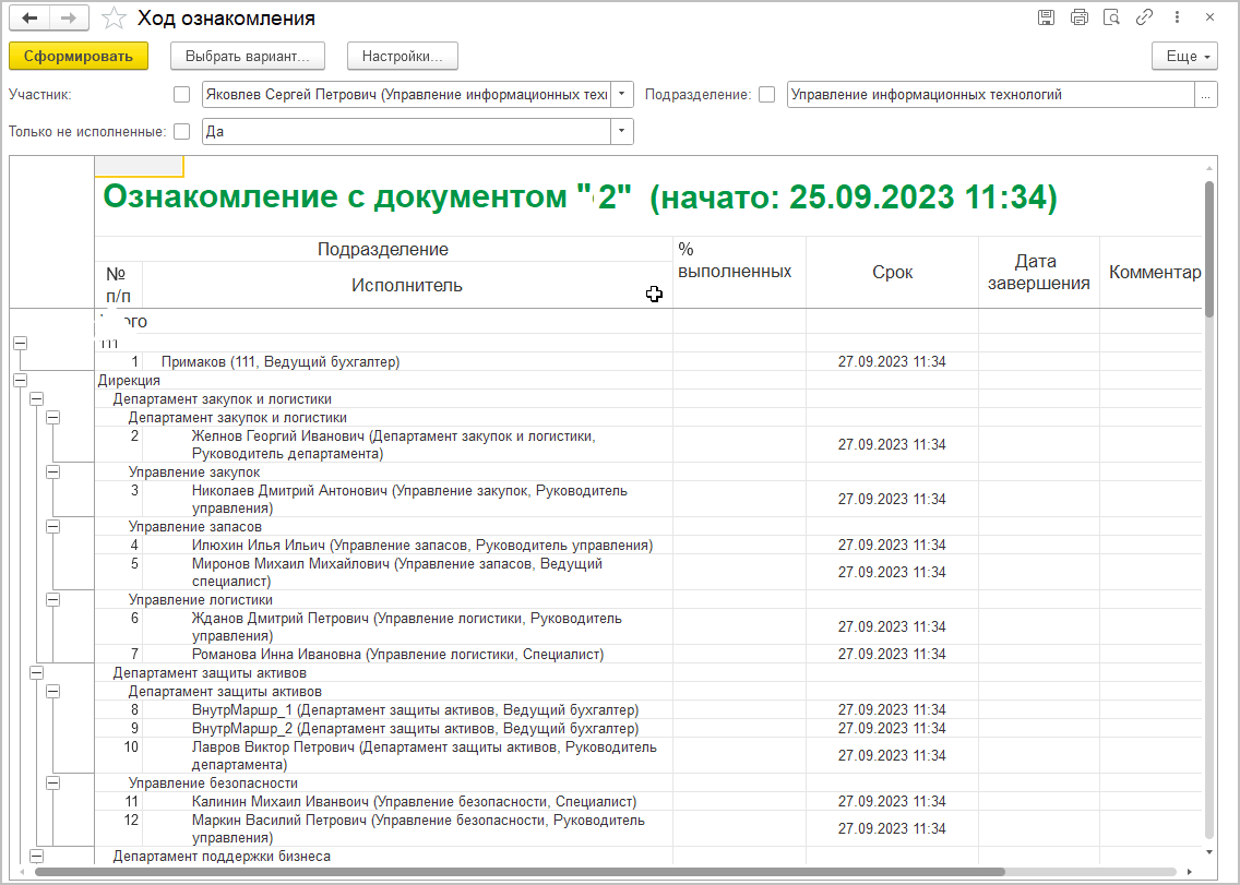 В отчете предусмотрены отборы по сотруднику, отделу, статусу выполнения.