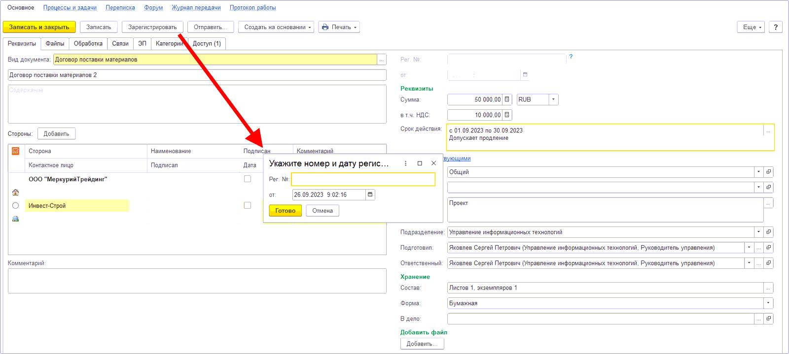 В новой версии программы в момент регистрации документа можно вручную ввести дату регистрации. Больше не придется сначала записывать новый документ, затем вводить дату регистрации.
