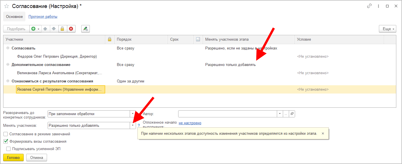 Для этого в карточке действий согласование, подписание, исполнение и ознакомление в настройке Менять участников необходимо выбрать вариант Разрешено только добавлять.