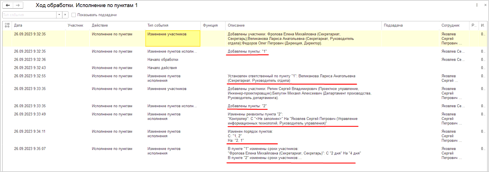 В новой версии программы в Ходе обработки фиксируются изменения пунктов исполнения:
