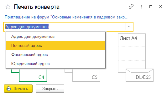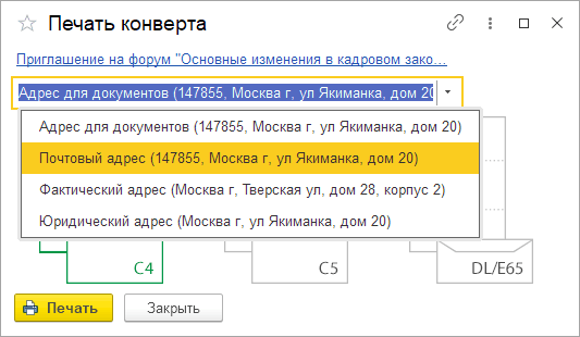 Теперь при подборе адреса для печати на конверте доступны все виды контактной информации с типом Адрес.