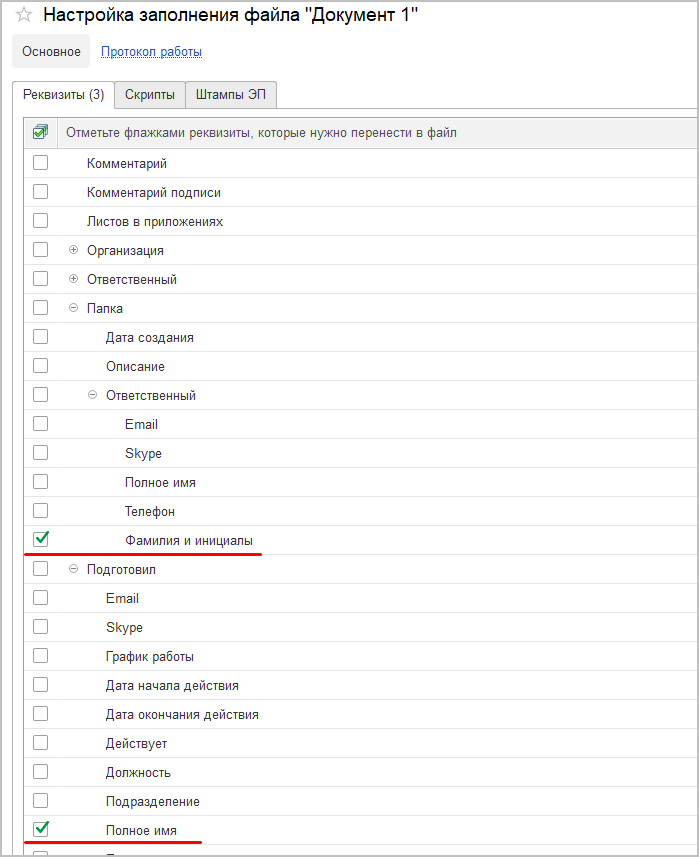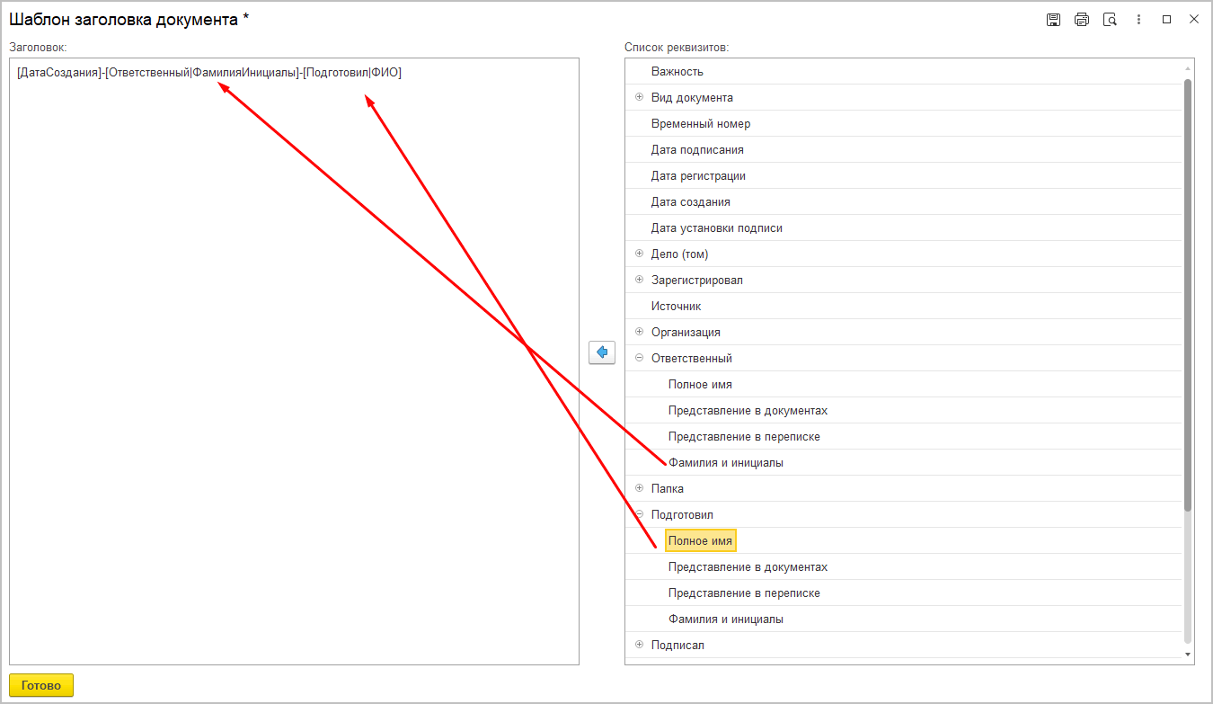 Для этого в конструкторе заголовка документа и в правиле автозаполнения полей файла достаточно выбрать соответствующий вариант представления сотрудника: Полное имя или Фамилия и инициалы.