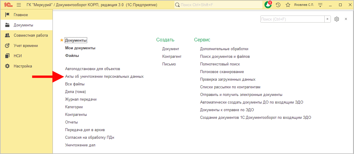 Если настройка установлена, то в меню раздела Документы доступны команды открытия списка актов об уничтожении.