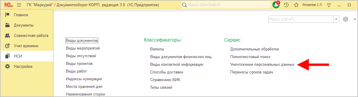 В меню раздела Нормативно-справочная информация открывается список Уничтожение персональных данных.