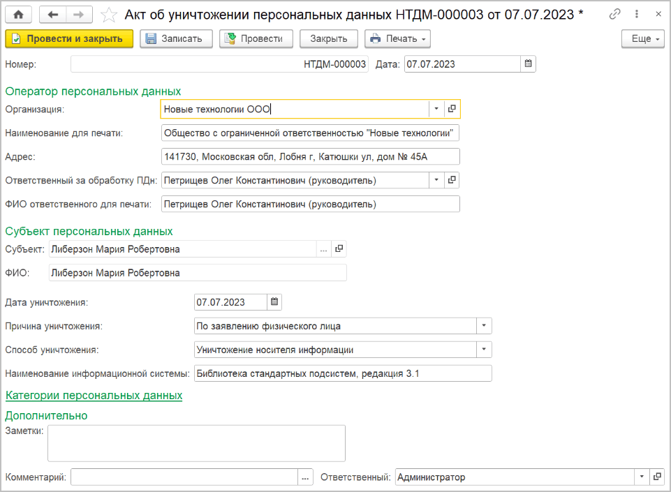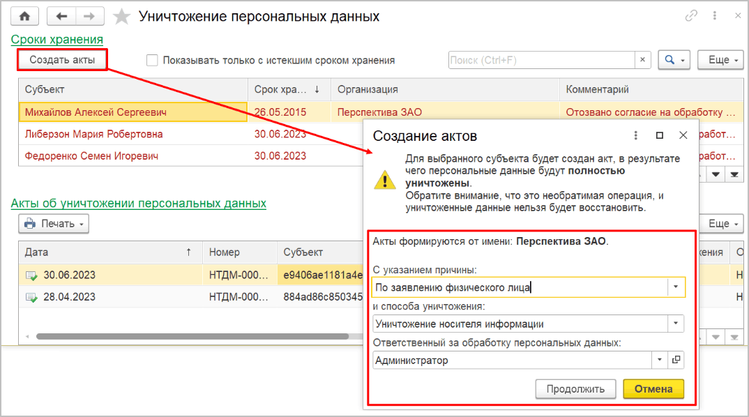 Важно! Данная операция является необратимой, уничтоженные персональные данные не смогут быть восстановлены.