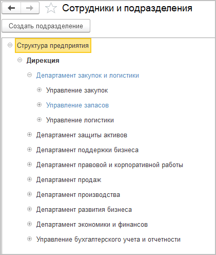 В списке Сотрудники и подразделения, если вышестоящий руководитель не заполнен, а вышестоящее подразделение заполнено, подразделение выделяется синим шрифтом.