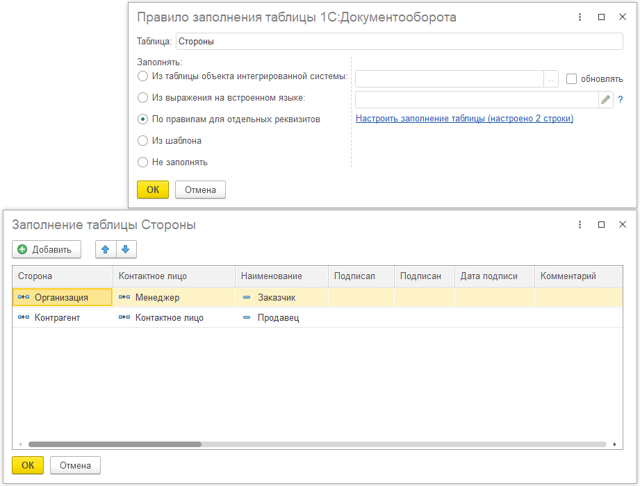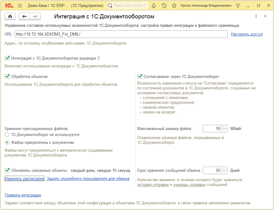Настройка интеграции выполняется в обеих базах. Причем на стороне интегрируемой системы в правилах интеграции нужно будет указать ссылку на созданные в 1С:Документообороте соответствующие им правила загрузки данных в 1С:Документооборот.