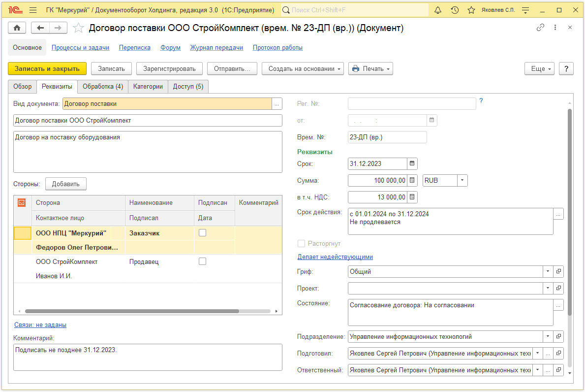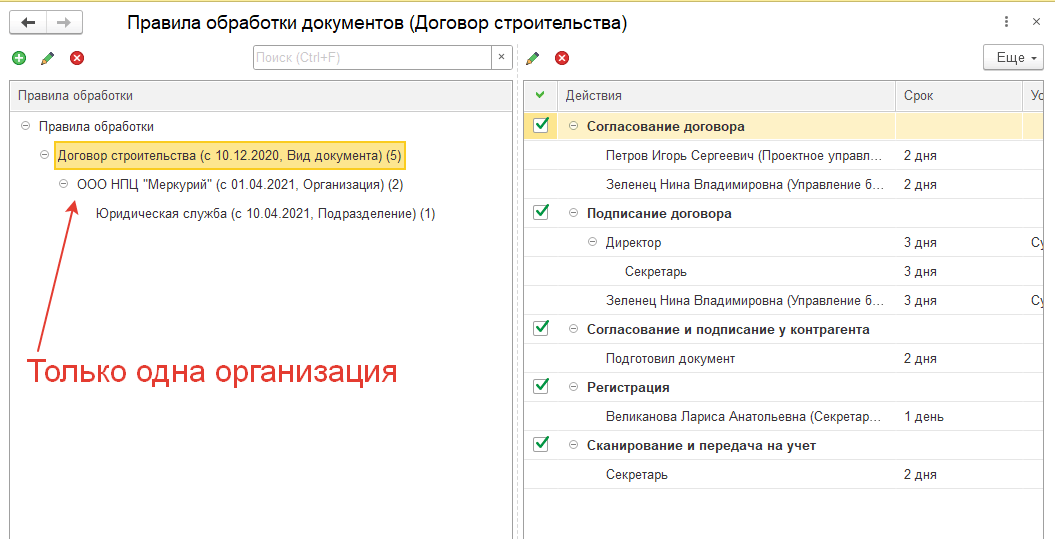 Все созданные таким образом в 3.0 настройки обработки документов будут «выключены» для того, чтобы администратор их проверил и скорректировал. Необходимо сделать только одну обработку активной – для этого необходимо удалить дату окончания для настройки и снять флаг Недействительна в Правилах обработки документа.