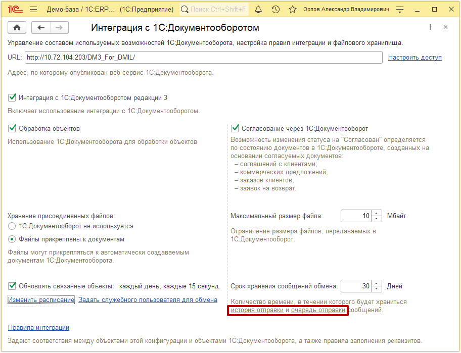 3. Установить настройки. Можно включить/отключить регламентное задание, выполняющее обмен данными с интегрируемыми системами, настроить его расписание и срок хранения истории отправки сообщений обмена. Значения настроек можно оставить по умолчанию.