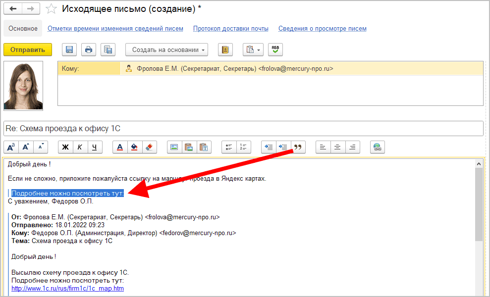 Если в получателях письма только один уникальный контрагент, программа добавляет в список выбора полное представление адреса.