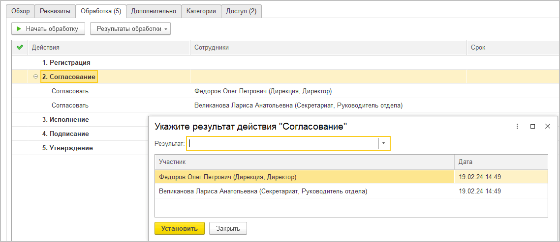 В открывшемся окне указать общий результат выполнения действия (например, «Согласовано», или «Подписано»).