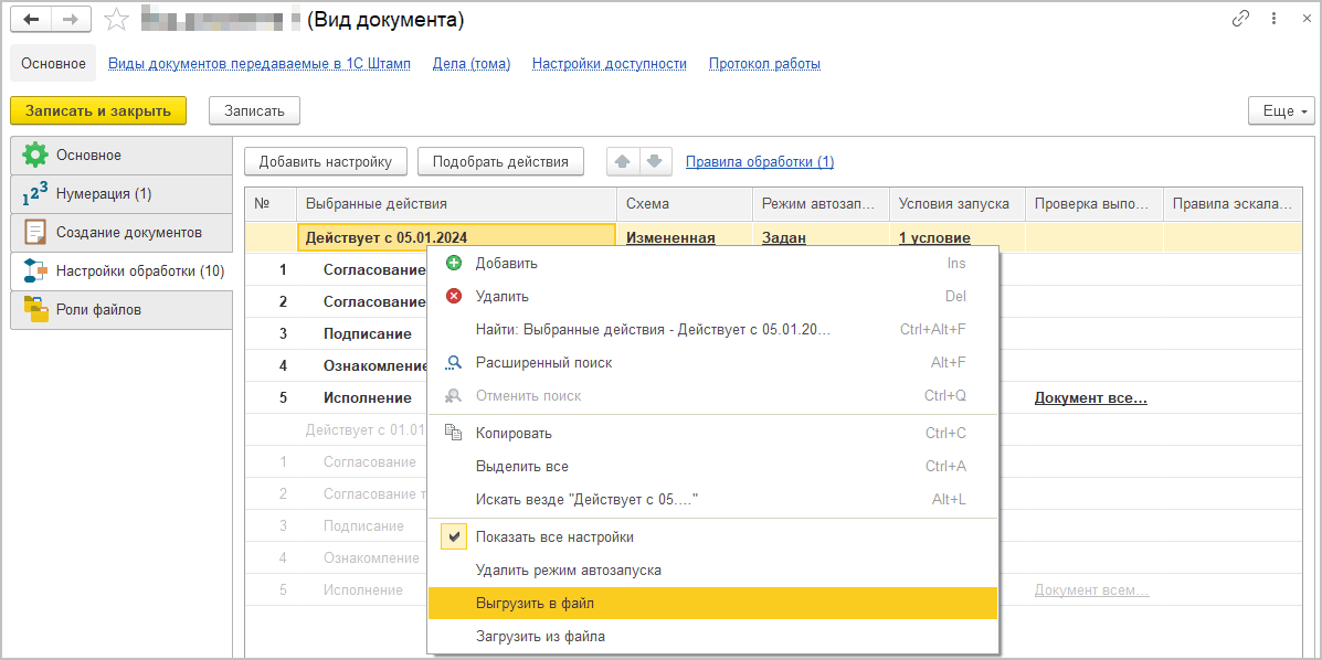Для выгрузки обработки в карточке вида документа в контекстном меню настроек обработки предусмотрена команда Выгрузить в файл.