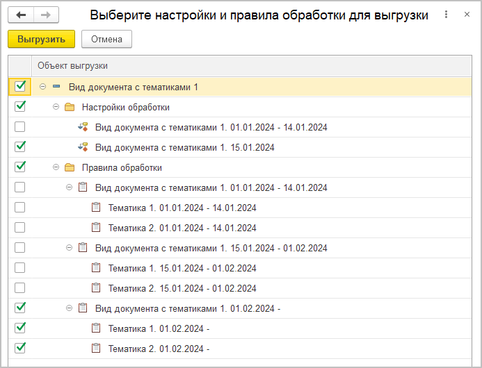 После выполнения команды откроется окно для выбора настроек и правил для выгрузки.