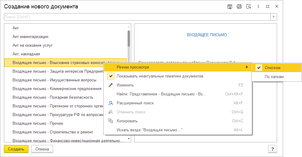 Список доступных шаблонов, открывающийся при создании документа, теперь можно сгруппировать как при включенном, так и отключенном учете по тематикам следующим образом: