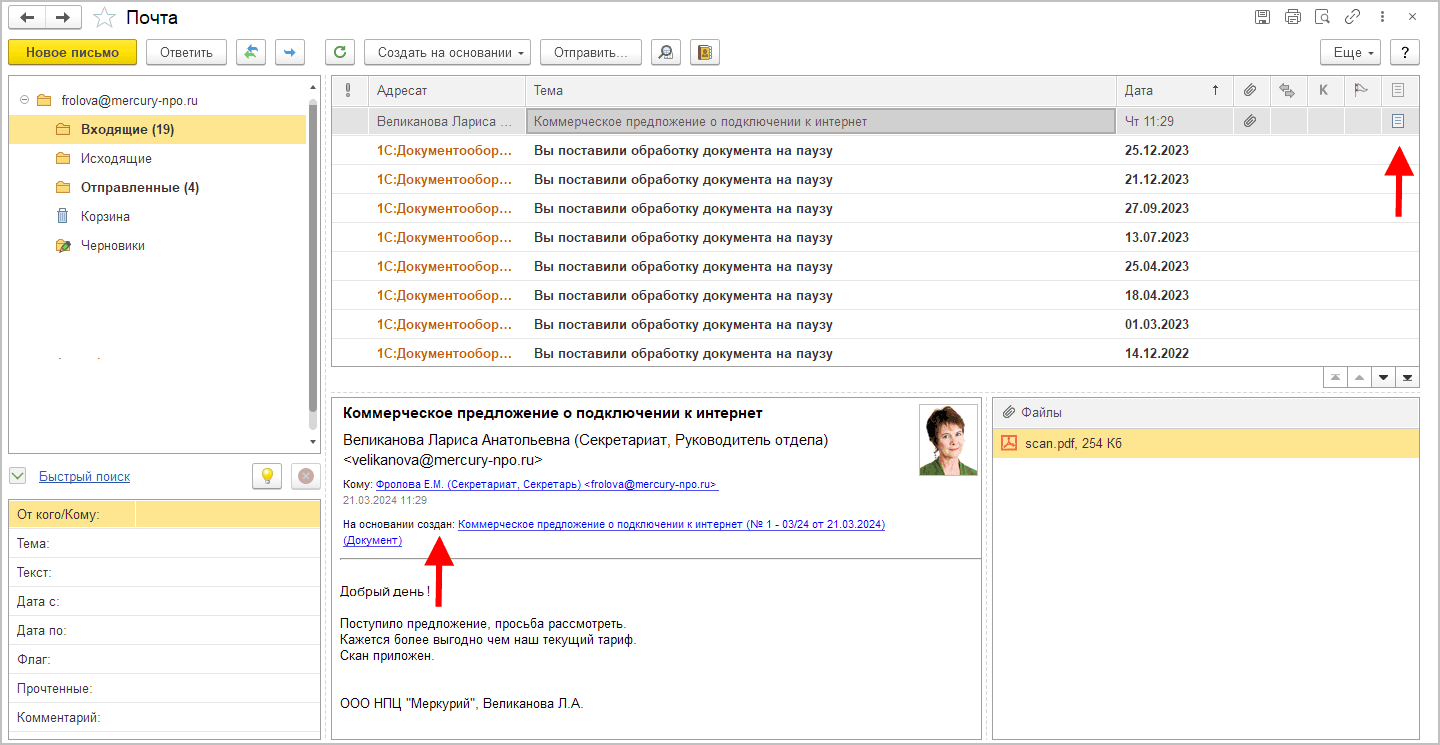 Если на основании письма был создан документ, то в колонке Есть документ отображается иконка .