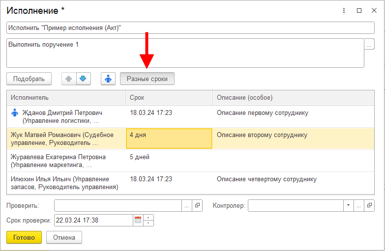 В новой версии программы в действиях исполнение, согласование и подписание можно устанавливать каждому исполнителю свой срок с помощью кнопки Разные сроки. Настройка действует одинаково и на относительный, и на абсолютный срок.