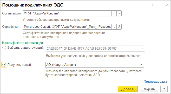 После выполнения команды программа предложит выбрать сертификат ЭП для регистрации учетной записи и вариант идентификатора организации: использовать существующую учетную запись ЭДО или получить новую.