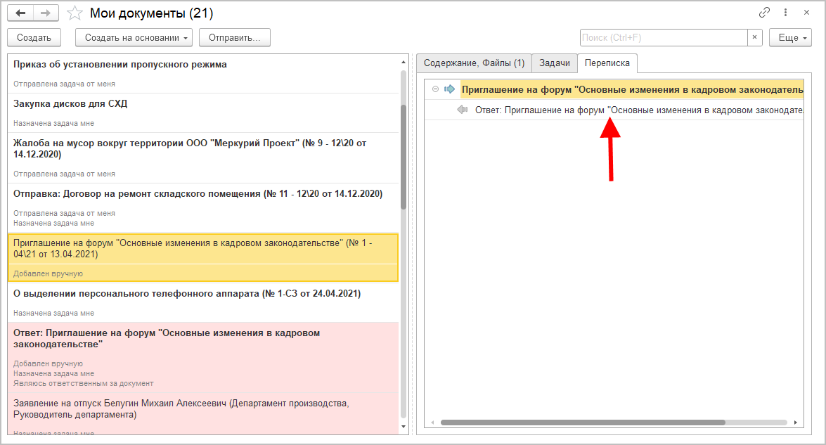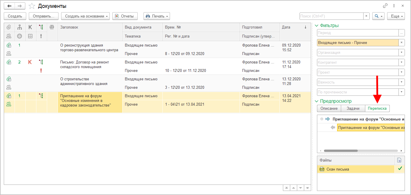 Теперь для документов, являющихся входящей и исходящей корреспонденцией, в списках отображается закладка Переписка.