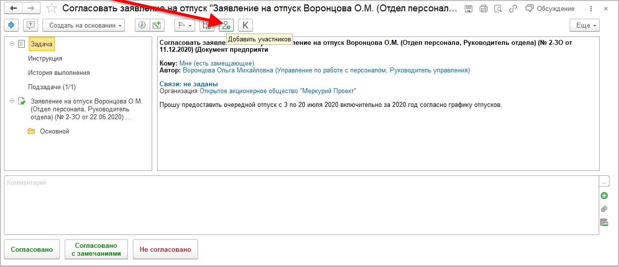 Для этого на командной панели карточки задачи появилась команда Добавить участников. Она отображается для действий Согласования, Исполнения, Подписания, Ознакомления, если у пользователя есть право изменения действия.