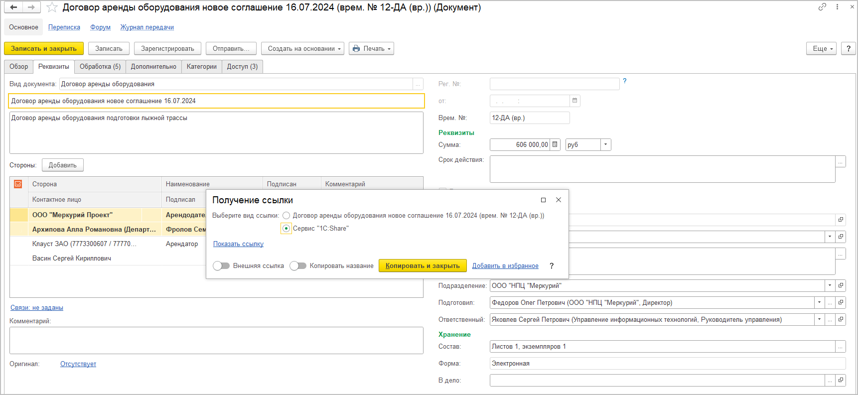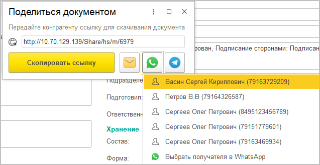 В карточке документа ЭДО можно связать его с существующим документом 1С:Документооборота с помощью гиперссылки Подобрать.