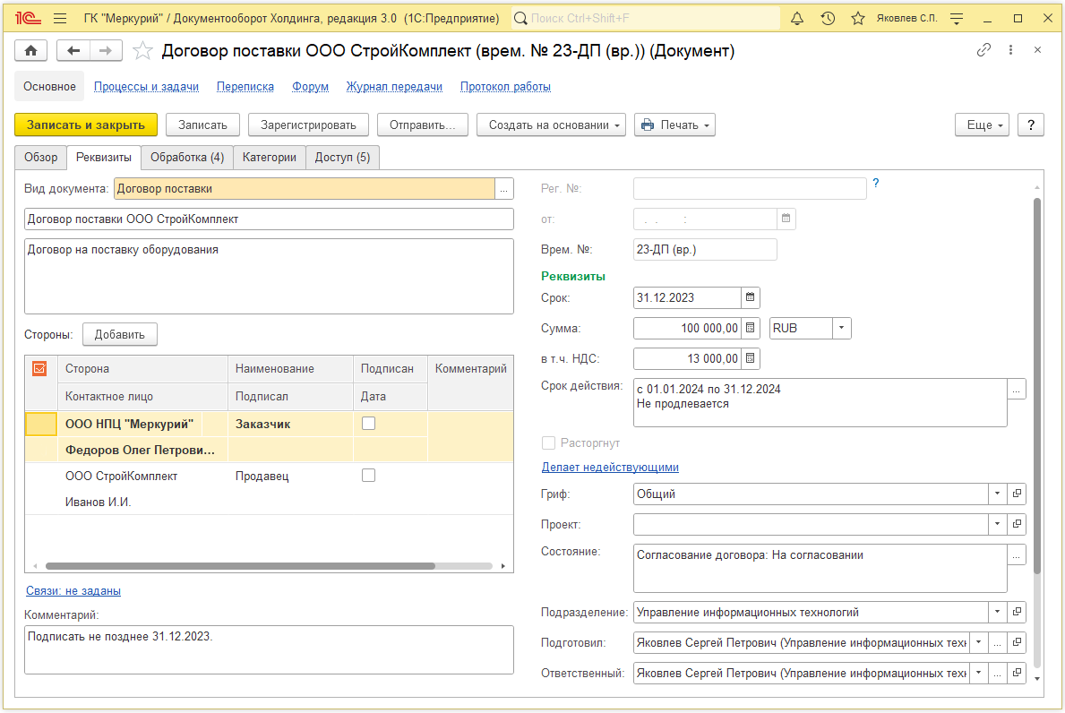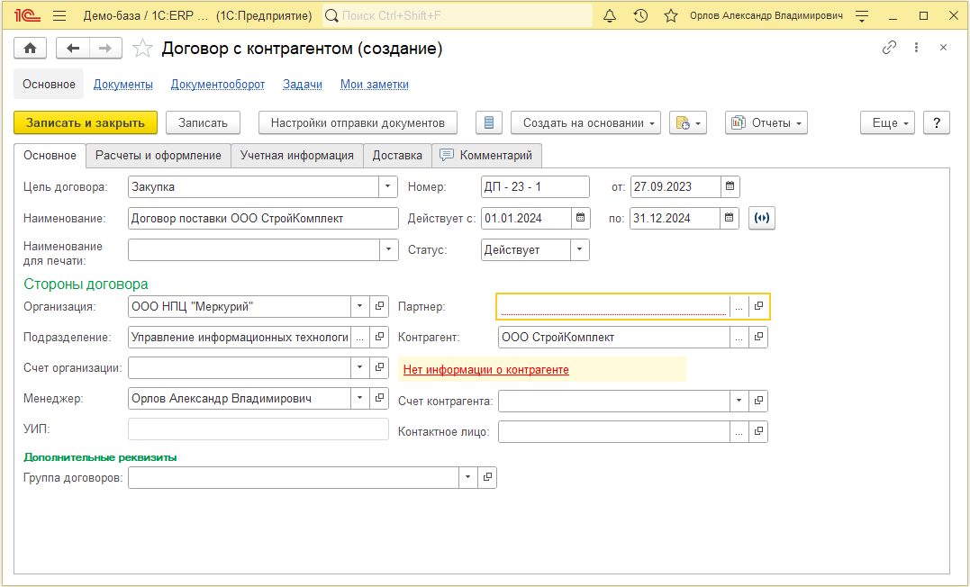 После выбора шаблона откроется незаписанная карточка документа, с предложением заполнить необходимые реквизиты.