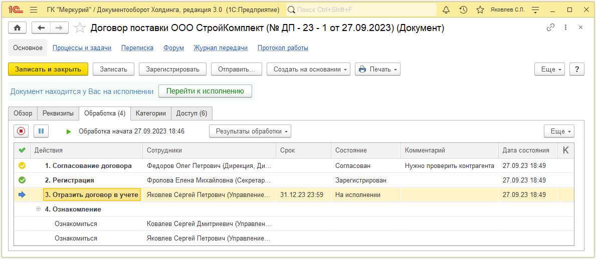 Если исходящий документ ЭДО отклонен контрагентом, то ответственному за документ 1С:Документооборота придет соответствующее уведомление.