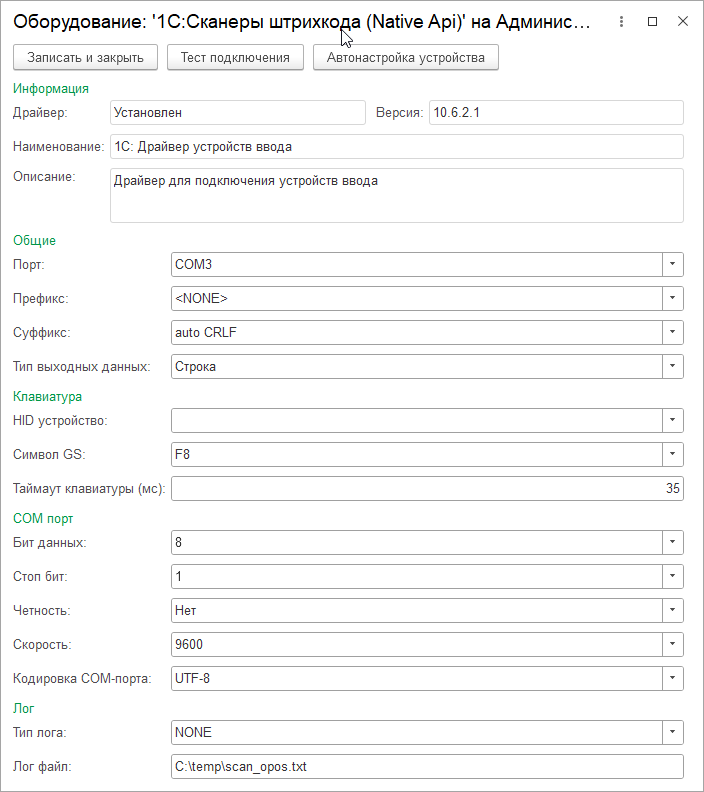 Чтобы проверить настройки сканера в драйвере 1С:Сканеры штрихкода необходимо нажать Тест подключения.