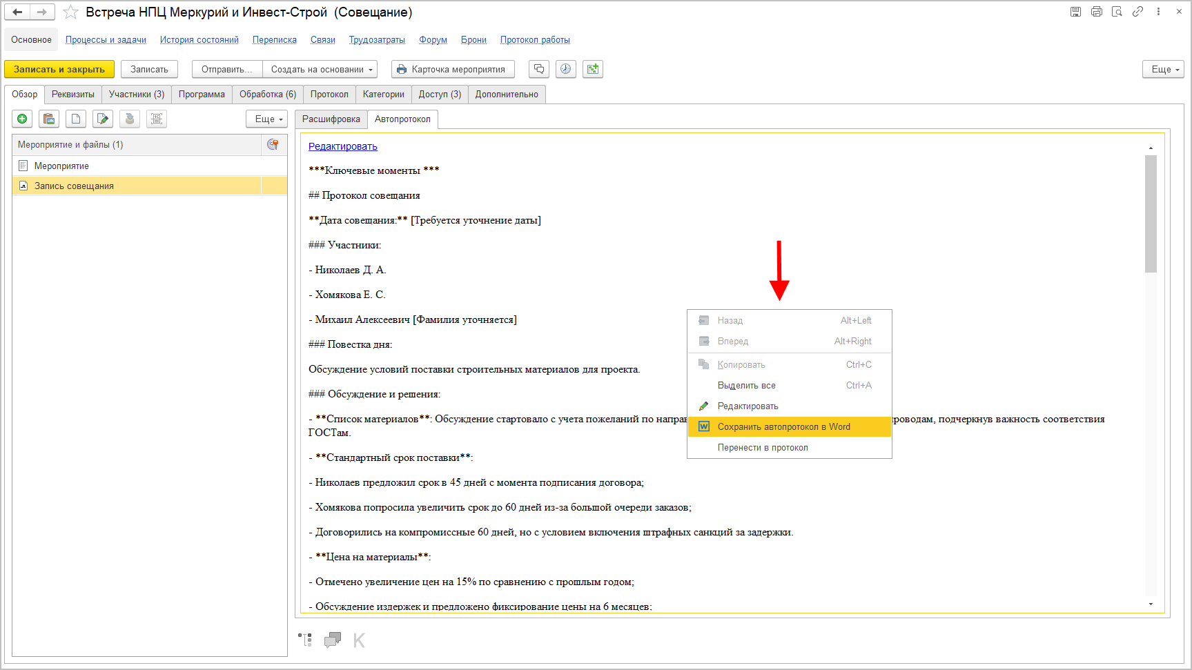 Редактирование расшифровки и автопротокола