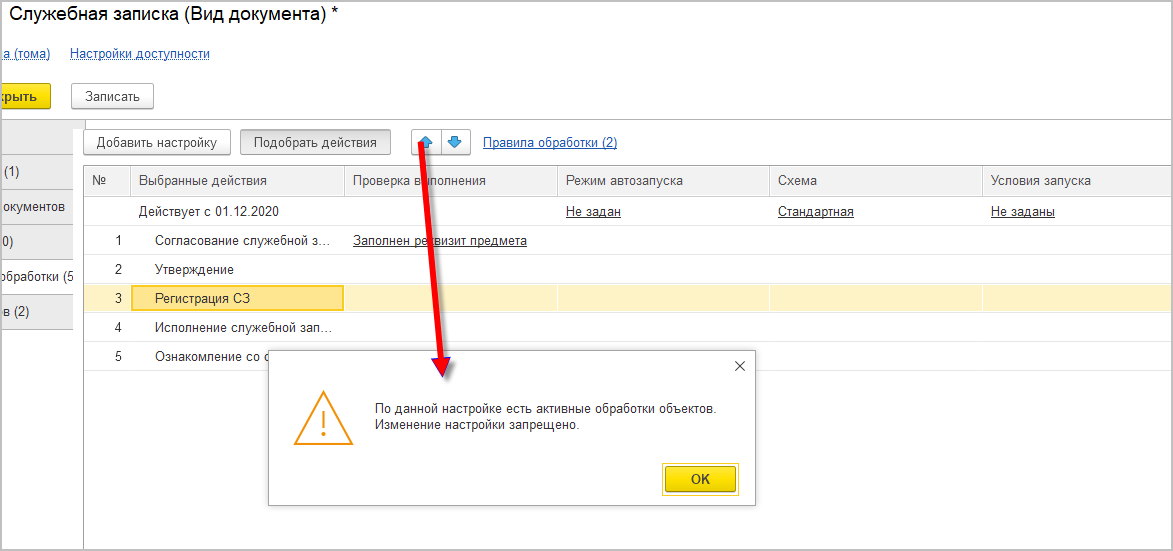 Теперь при попытке добавить, удалить или изменить настройки такой обработки, сотрудник увидит предупреждение.