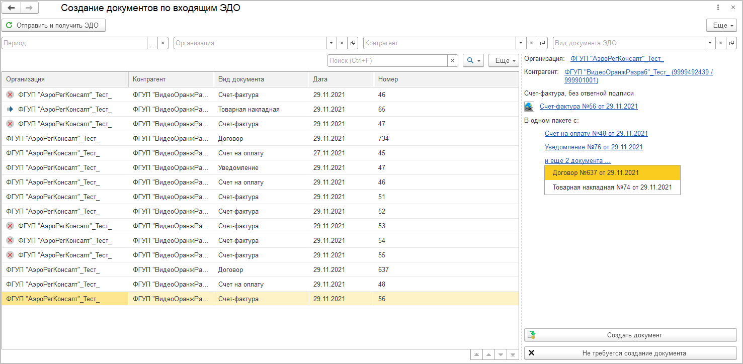 Команда Еще – Обработать создание автоматически запускает процедуру создания документов тех видов ЭДО, для которых в настройках приема указано автоматическое создание.