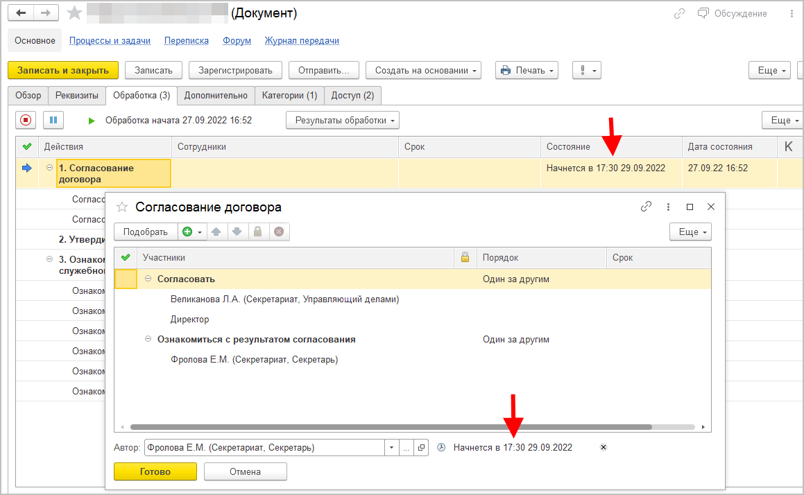 Если отложное начало выполнения действия настроено, то при старте обработки такое действие переходит в «режим ожидания». Запланированная дата начала его выполнения отображается в колонке Состояние.