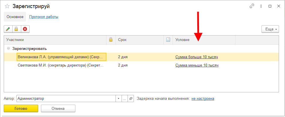 В новой версии программы можно использовать условия и при настройке регистрации и утверждения. Это позволит, например, добавлять в эти действия исполнителей в зависимости от суммы, тематики, важности документа и других условий.