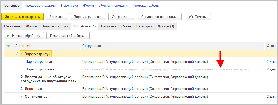 Для настройки необходимо в правилах обработки открыть карточку настройки действия, выбрать участников и добавить условие.