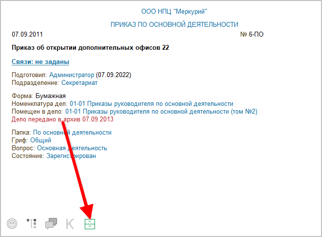На закладке Обзор карточки документа отображается ссылка с датой передачи дела в архив. По ссылке открывается документ-регистратор.