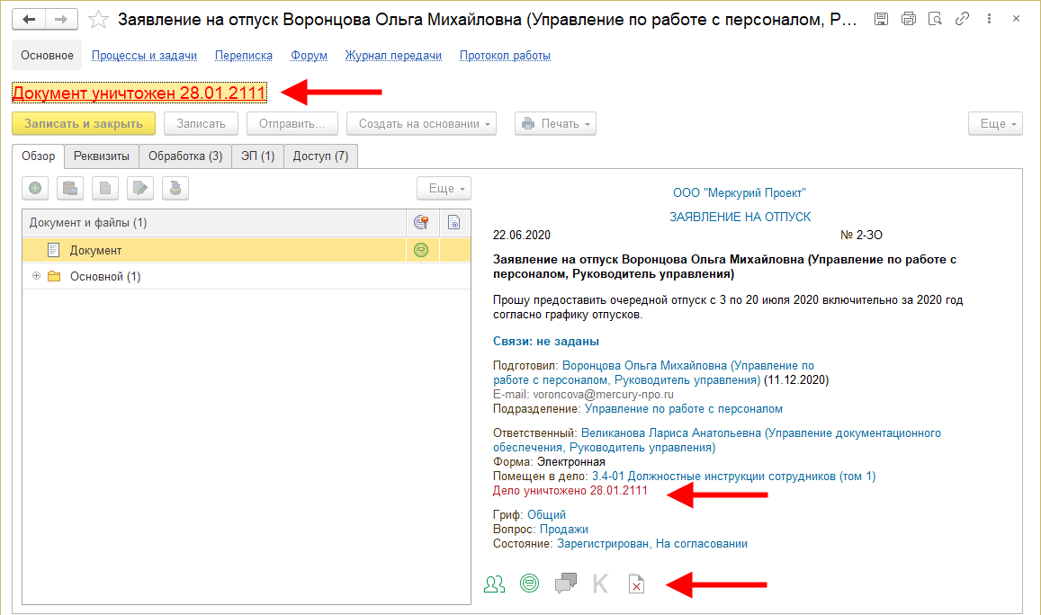 открывается документ-регистратор. Карточки уничтоженных дел доступны только для чтения.