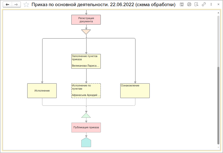 Если шаблон комплексного процесса содержит таблицу действий с последовательным и параллельным выполнением, то при настройках обработки создается схема с соответствующим порядком действий.