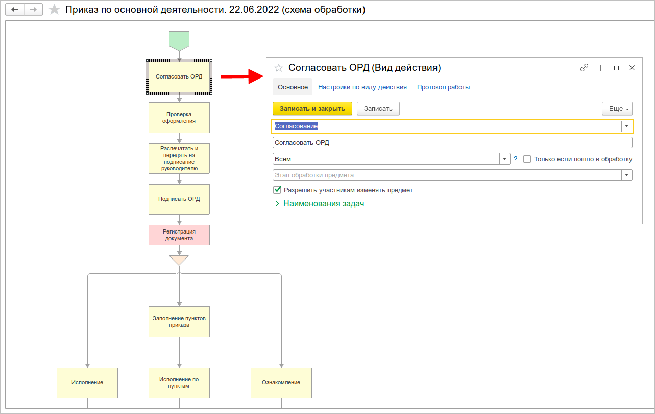 Для настройки обработки также формируется схема. В схеме повторяется тот же порядок выполнения, что и в таблице действий шаблона комплексного процесса.